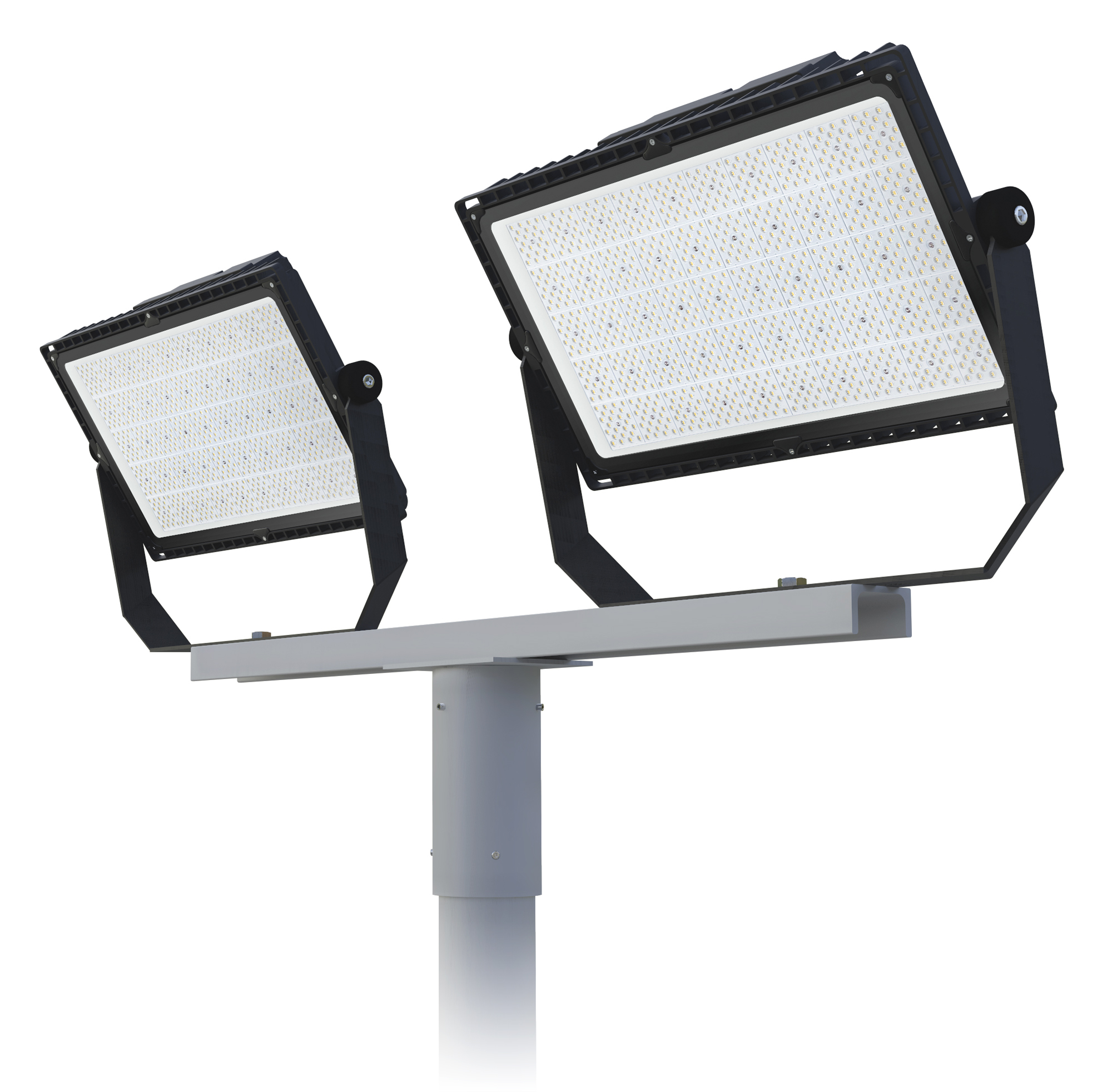Diese leistungsstarke LED Flutlichtanlage 1000 W bildet ein professionelles Set aus 2 Stück SUNLEDS RME-500 PRO (je 500 W Leistungsaufnahme), einem soliden Flutlichtmast (Lichtpunkhöhen wählbar: 12 m, 14 m, 16 m, 18 m, 20 m) und einer passenden, tragstabilen Traverse ab.